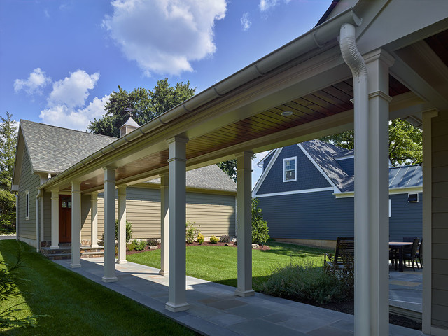 A detached garage connected with an enclosed walkway offers most the benefits of an attached garage you can see the garage way in the back.