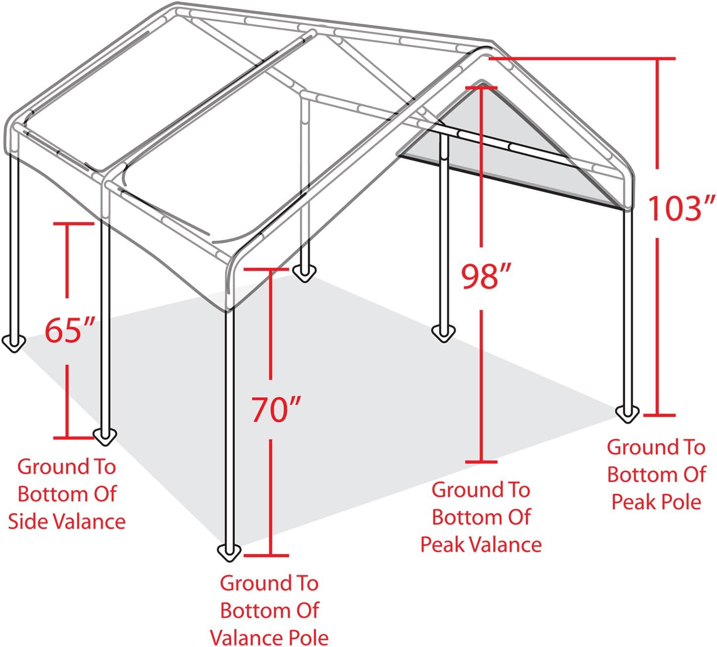 Gazebos king canopy 10 x 20 ft. It measures 20.00 x 10.00 x 11.00 feet. Large footpads provide the carport w/ solid foundation on hard or soft surfaces 6x leg design with 6x auger anchors, 103 peak height, 65 valance height